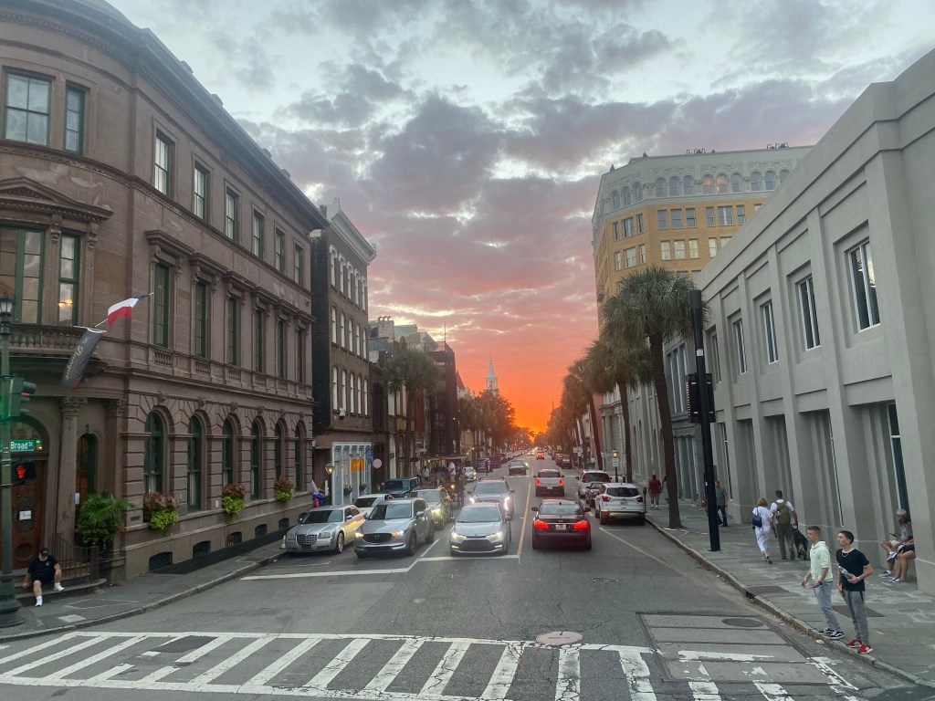 One of the best places to catch a sunset in the city can be seen standing on the steps of the old exchange building. The evening sky falls upon the street and it’s little alleys in shades of pink and blue that cotton candy would be envious of. The white steeple of St. Michael’s rises stately above the swaying palmettos that line the street, reflecting the vibrant hues of the sky.